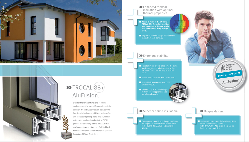 Osim poznate funkcionalnosti aluminijumske obloge, dodatne specijalne mogućnosti uključuju klizni spoj između funkcionalne aluminijumske obloge i PVC profila krila.Aluminijumski profil se nalazi u jedinstvenoj vezi sa PVC profilom. Na ceremoniji 2009. god. TROCAL AluFusion-u je uručena austrijska nagrada za očuvanje okoline “Daphne - duh okoliša” i izvrsnost projekta.